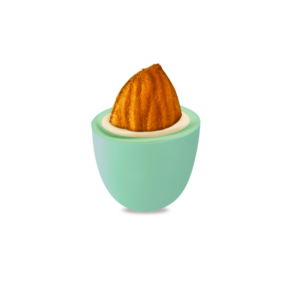 Целый поджаренный миндаль — твёрдый, с насыщенным ореховым вкусом и приятным хрустом. Его окружает нежнейший белый шоколад со вкусом рикотты и спелой груши. Ничего общего с тем парафиновым ощущением во рту, которое бывает от дешёвых сладостей. Этот вкус раскрывается постепенно: сначала — хруст миндаля, затем — кремовая сладость, и наконец — лёгкое, воздушное послевкусие груши.