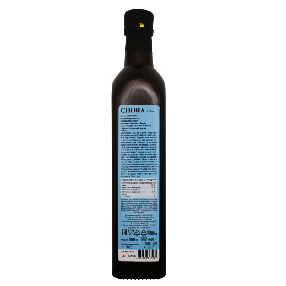 Оцените богатый аромат и тонкий вкус нерафинированного оливкового масла Chora. Полученное из редких оливок Мавроэлла Хораитика и Коронейка, это настоящий бриллиант среди исключительных оливковых масел. Благодаря раннему отжиму зеленых оливок в ноябре оно обладает минимальной кислотностью, что придает ему исключительные лечебные свойства. Насладитесь ароматом и вкусом, которыми вдохновлялись герои "Илиады" и "Одиссеи" Гомера.
