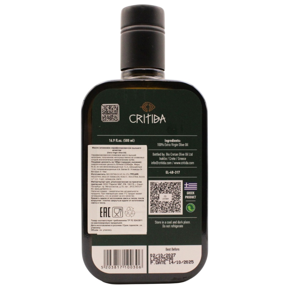 Характеристики Оливковое масло Critida Moresca Extra Virgin Греция, 500 мл