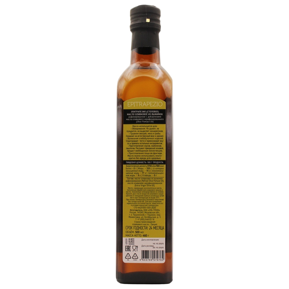 Состав оливкового масла для жарки Pomace EPITRAPEZIO Elmar Crete Греция, 500 мл: 100% оливковое масло из выжимок, рафинированное с добавлением масла оливкового нерафинированного (Olive Pomace Oil).