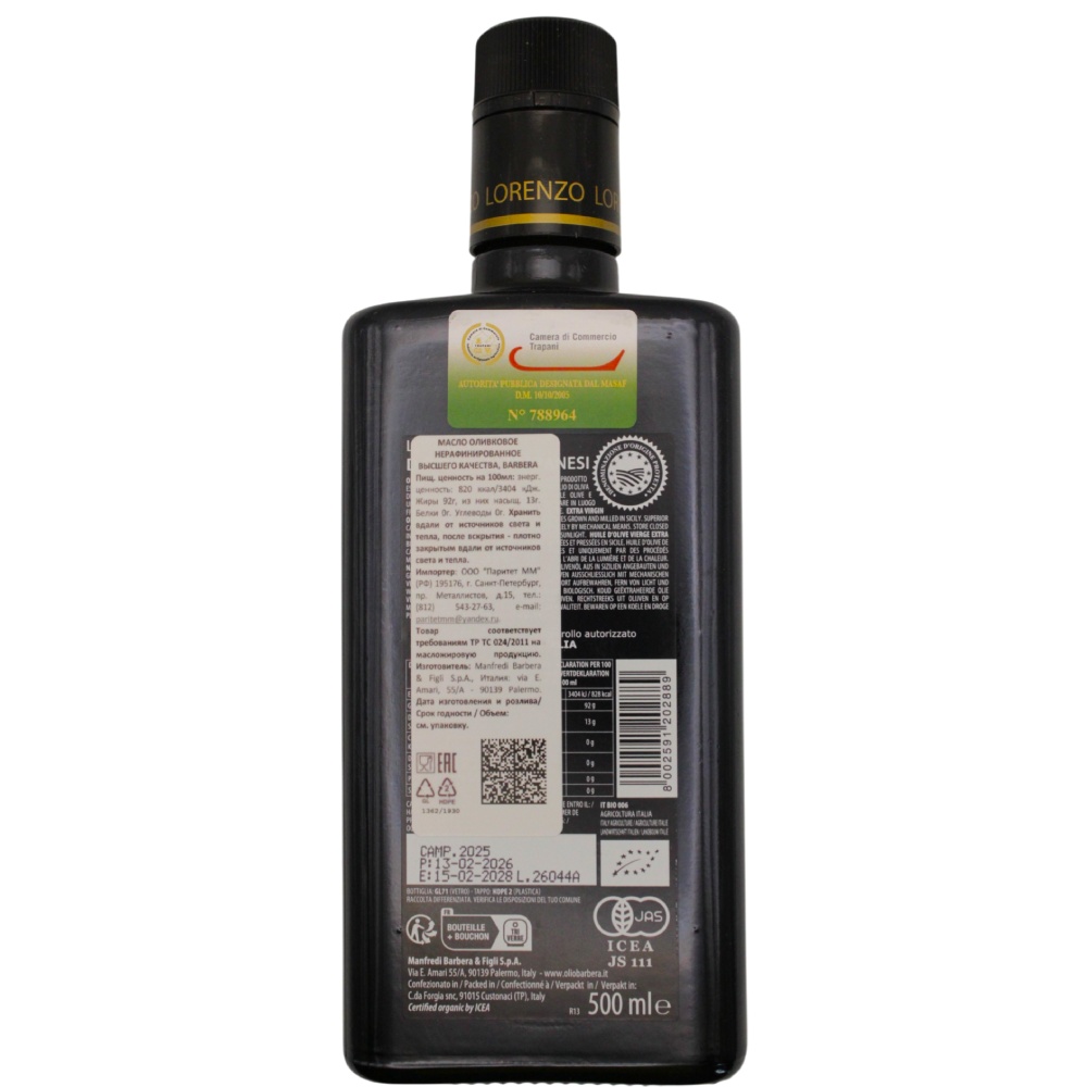 Состав органического итальянского оливкового масла Lorenzo №1 DOP Cerasuola Extra Virgin, 500 мл: Оливковое масло высшего качества первого холодного отжима из органических оливок сорта Черазуола.