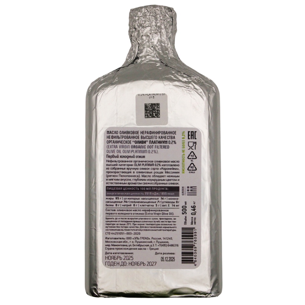 Состав нефильтрованного греческого оливкового масла OLIVI PLATINUM, 500 мл: Оливковое масло нерафинированное первого холодного отжима (Extra Virgin).