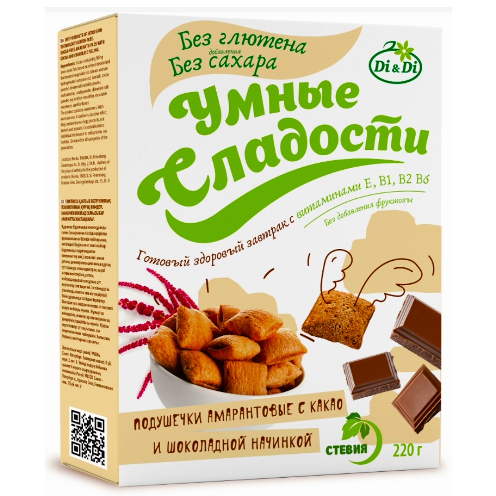 Подушечки амарантовые Умные сладости без глютена с какао и шоколадной начинкой, 220г компании Di&Di